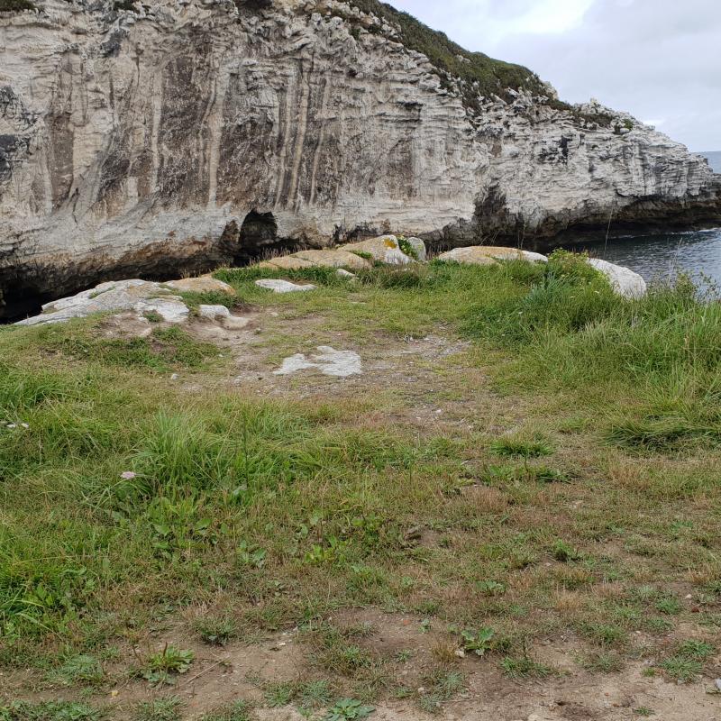Los materiales se hallaron en superficie, englobados en limos amarillentos del horizonte B de un suelo desarrollado sobre la roca madre caliza en la zona acantilada, únicamente se han encontrado dos piezas líticas: raedera y hendedor sobre lasca.