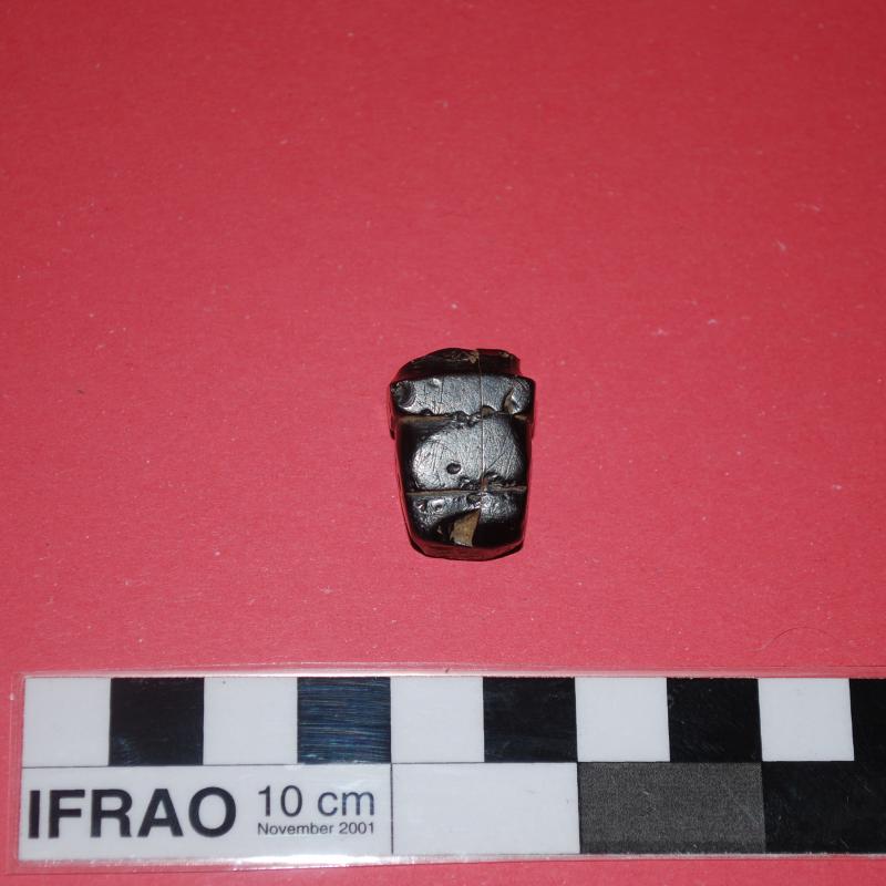 Es una pieza pequeña, de escasos 2 cms, de sección rectangular de color negro intenso y brillante, realizada en azabache. El extremo distal está roto, pero conserva una perforación transversal en la parte superior. La pieza está dividida en tres partes (en origen podían ser cuatro secciones) mediante incisiones que siguen el contorno de la pieza. La superficie está perfectamente pulida.